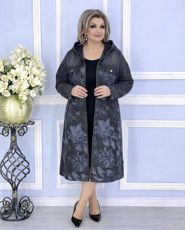 Кардиган выполнен из классической джинсовой ткани. СРедняя плотность, приятная, пластичная. В данной модели сочетаются ткани компаньоны- однотон и принтованная.