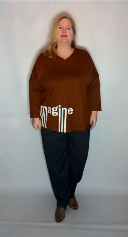 Демисезонная коричневая блуза с принтом свободного кроя выполнена из мягкого дышащего трикотажа.