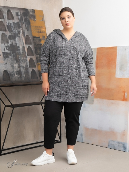 Туника прямого силуэта, с удлиненной линией плеча, выполнена из трикотажного полотна с рисунком в клетку. Модель с притачным капюшоном на углубленной горловине. Рукав длинный, суженный к низу. Удобный крой модели скроет возможные недостатки фигуры и позволит чувствовать себя комфортно при любых обстоятельствах.