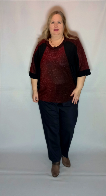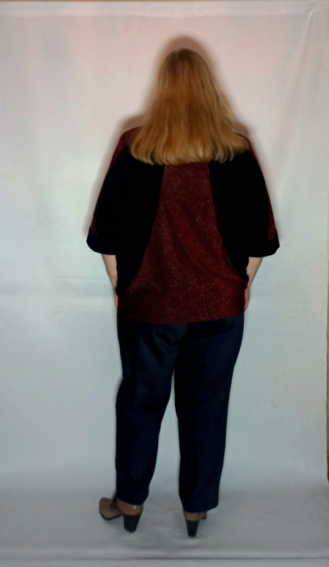 Нарядный блузон выполнен из сочетания двух видов трикотажа: черного однотонного и  трикотажа с люрексом. Трикотаж не осыпается (  нить). Трикотаж средней плотности, эластичный, приятный  к телу.