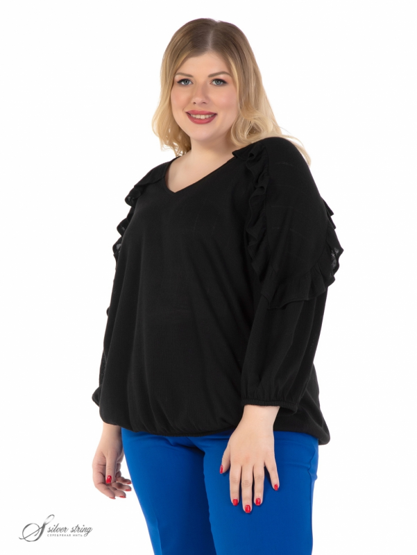 Оригинальный джемпер, свободного силуэта, выполнен из фактурного однотонного трикотажного полотна. Горловина У-образной формы. Модель с просторным рукавом длиной за локоть. Низ рукава, как и низ изделия, обработан эластичной тесьмой. На полочке и спинке расположена единая кокетка, переходящая на рукав. Линия кокетки подчеркнута элегантной рюшкой. Модель отлично скрывает проблемные зоны, а эффектный дизайн позволит чувствовать комфортно и стильно.