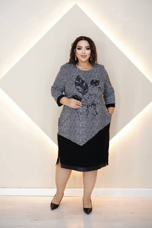 Элегантное платье выполнено из сочетания  меланжевого трикотажа и трикотажа лапша.