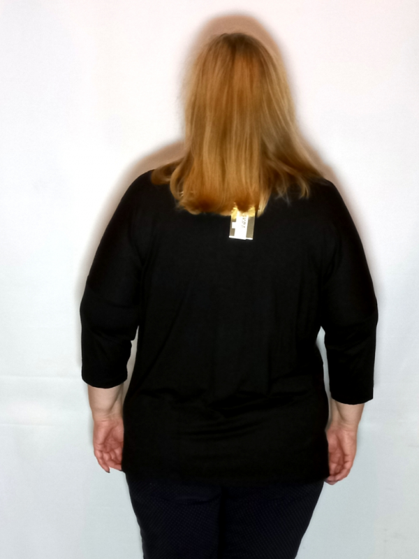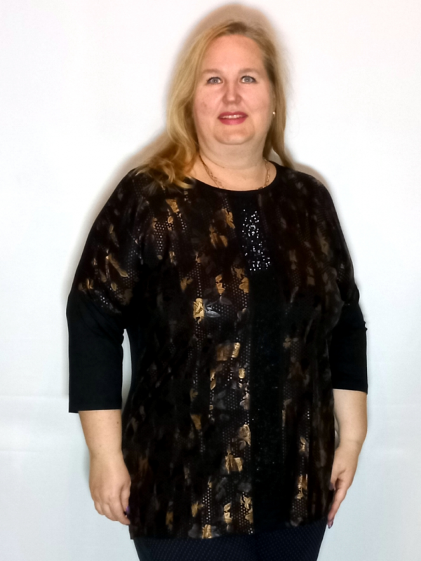 Полочка сложнокроенная, основная часть из трикотажа с рисунком, по середине вставка вертикальной полосы из однотонного трикотажа, которая декорирована черными термостразами.