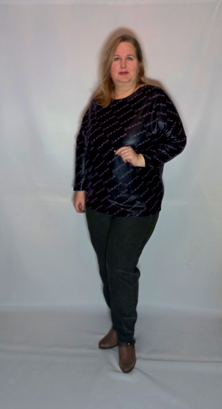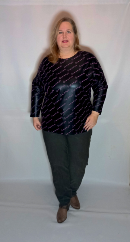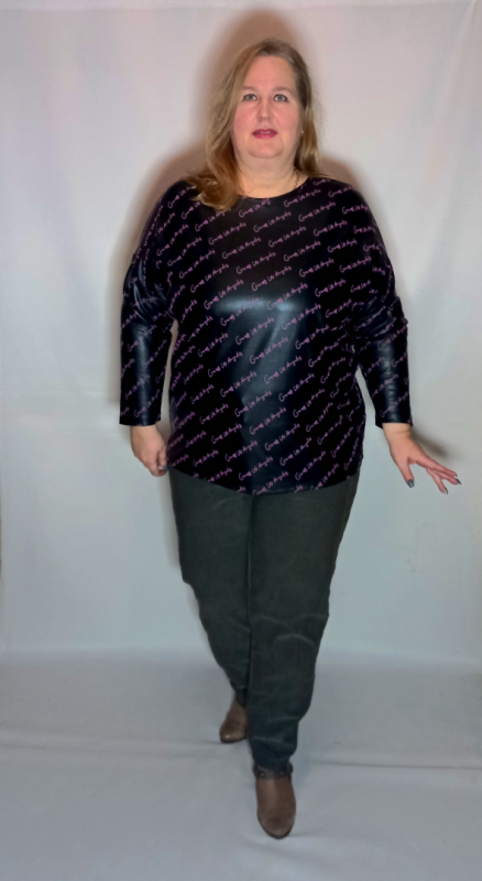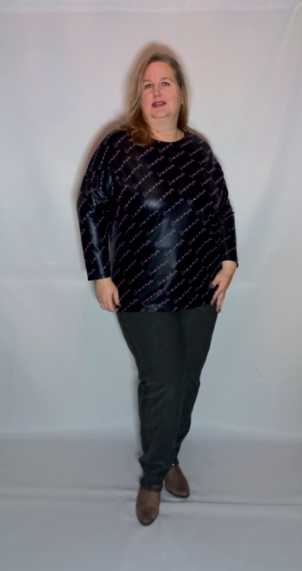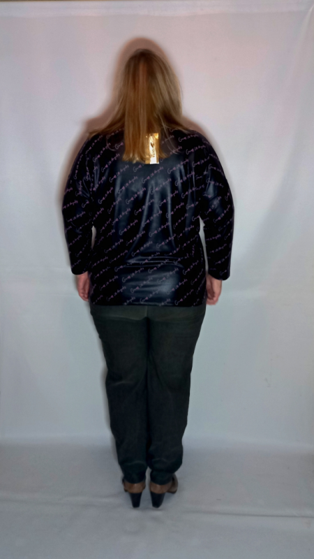 Трендовая туника выполнена из трикотажного полотна имитирующего кожу.