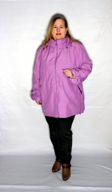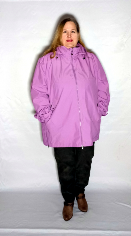 Глубокий капюшон, отстегивается. Внутренняя его поверхность из ткани с рисунком ( такой же декор  на рукавах и на полочке вставка в области карманов.