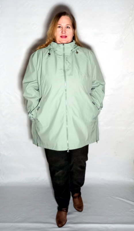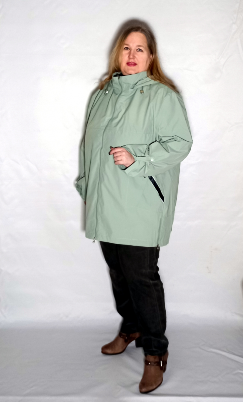 Глубокий капюшон, отстегивается. Внутренняя его поверхность из ткани с рисунком ( такой же декор  на рукавах и на полочке вставка в области карманов.